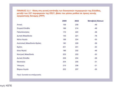 Μεταξύ των 237 περιφερειών του δείγματος των χωρών της ΕΕ27 για τις οποίες υπάρχουν διαθέσιμα στοιχεία, οι ελληνικές περιφέρειες καταλαμβάνουν τις τελευταίες θέσεις στον μέσο μισθό, σε όρους αγοραστικής δύναμης.