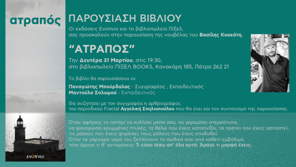 Οι εκδόσεις Ενύπνιο και το βιβλιοπωλείο Πίξελ books σας προσκαλούν στην παρουσίαση της νουβέλας Ατραπός του Βασίλη Κοκκότη στην Πάτρα .