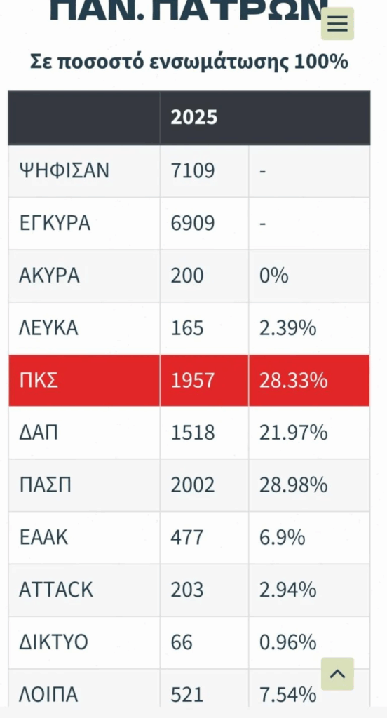 Κατά τις φοιτητικές εκλογές στο Πανεπιστήμιο Πατρών πρώτη δύναμη ήλθε η ΠΑΣΠ, σύμφωνα με επίσημη ανακοίνωση της Πανσπουδαστικής που ανάρτησε στο site της.