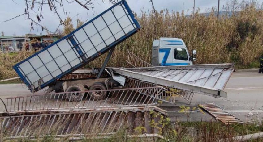 Κάτω από συνθήκες που ερευνώνται το φορτηγό προσέκρουσε στη γέφυρα, την παρέσυρε και το αποτέλεσμα ήταν να καταρρεύσει.