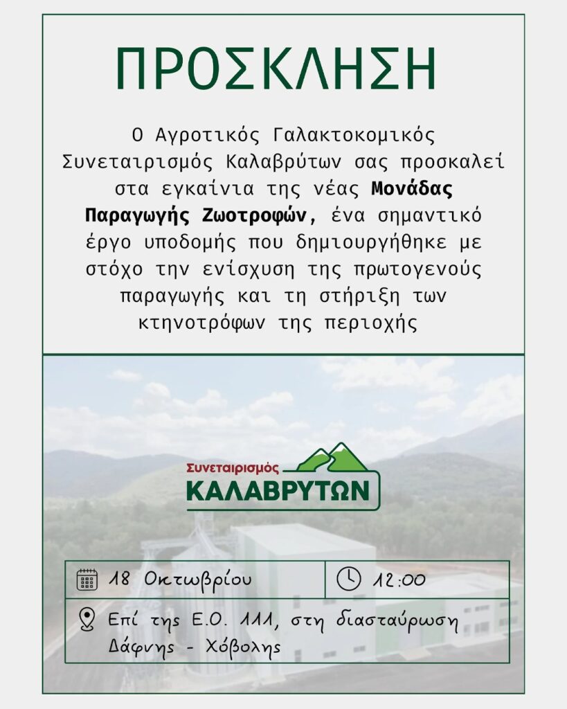 Αγροτικός Γαλακτοκομικός Συνεταιρισμός Καλαβρύτων: Πρόσκληση στα εγκαίνια νέας Μονάδας Παραγωγής Ζωοτροφών