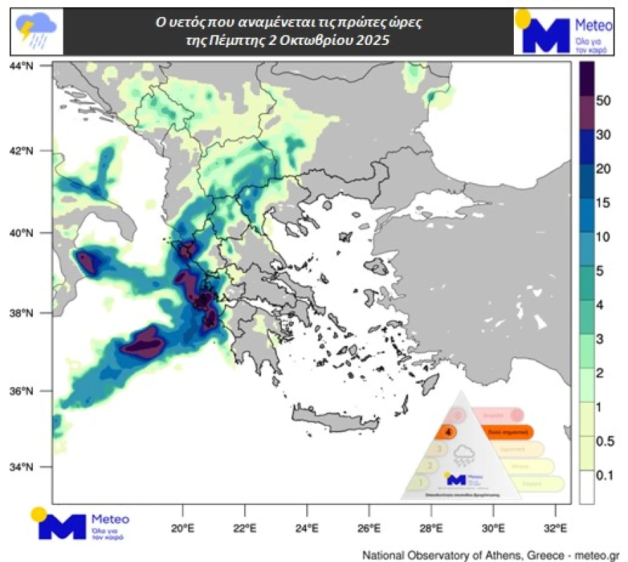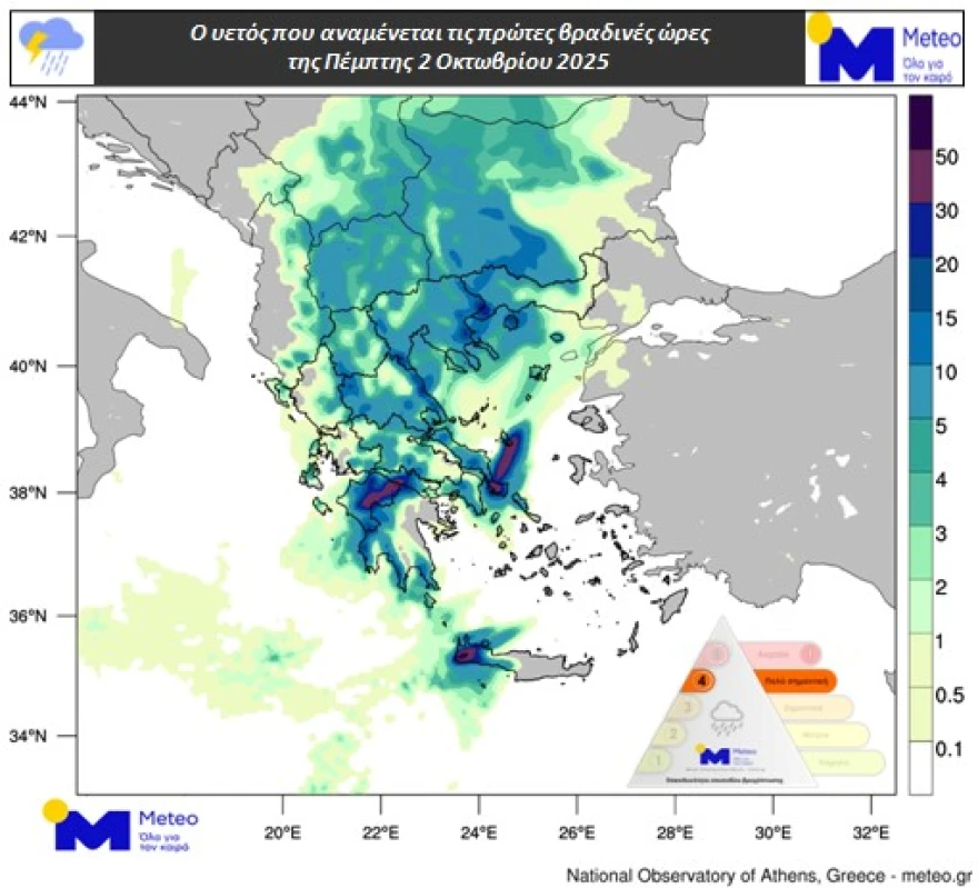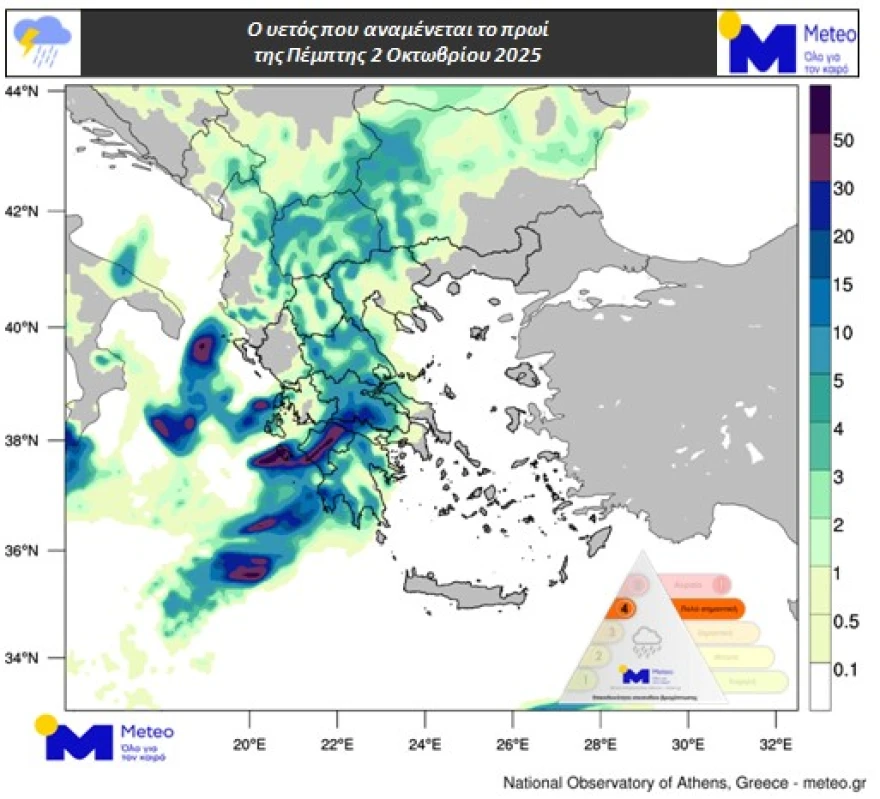 Σύμφωνα με την κατηγοριοποίηση των επεισοδίων βροχόπτωσης (Regional Precipitation Index), η οποία εφαρμόζεται από τη μονάδα Meteo του Εθνικού Αστεροσκοπείου Αθηνών, το επεισόδιο βροχόπτωσης για την Πέμπτη 02/10 κατατάσσεται στην Κατηγορία 4 (Πολύ Σημαντική).