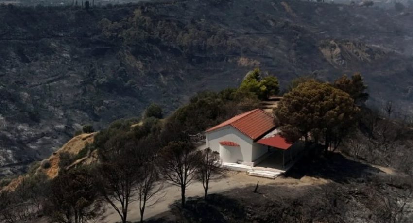 Στα Καµίνια της Πάτρας µια µικρή εκκλησία στάθηκε όρθια ανάµεσα σε δεκάδες στρέµµατα που κάηκαν από την πυρκαγιά που έπληξε την περιοχή.