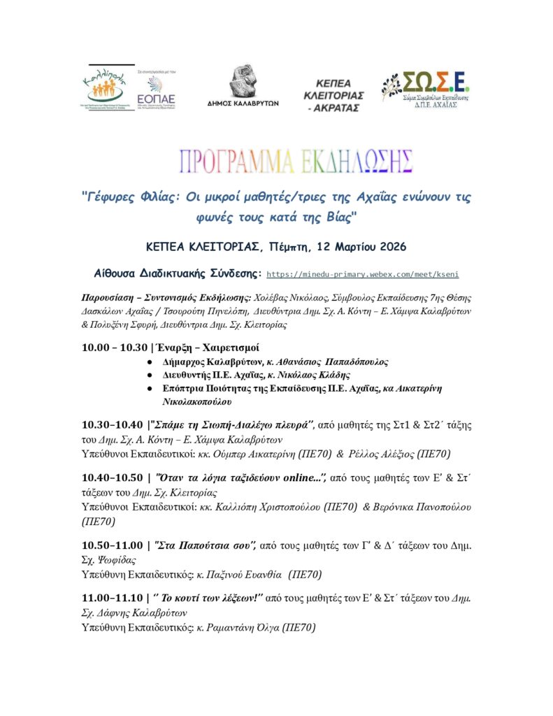Στο πλαίσιο της εβδομάδας δράσεων θα πραγματοποιηθεί εκδήλωση για τα σχολεία του Δήμου Καλαβρύτων την: Πέμπτη 12 Μαρτίου 2026 στην Μαθητική Εστία Κλειτορίας (ΚΕΠΕΑ Κλειτορίας)