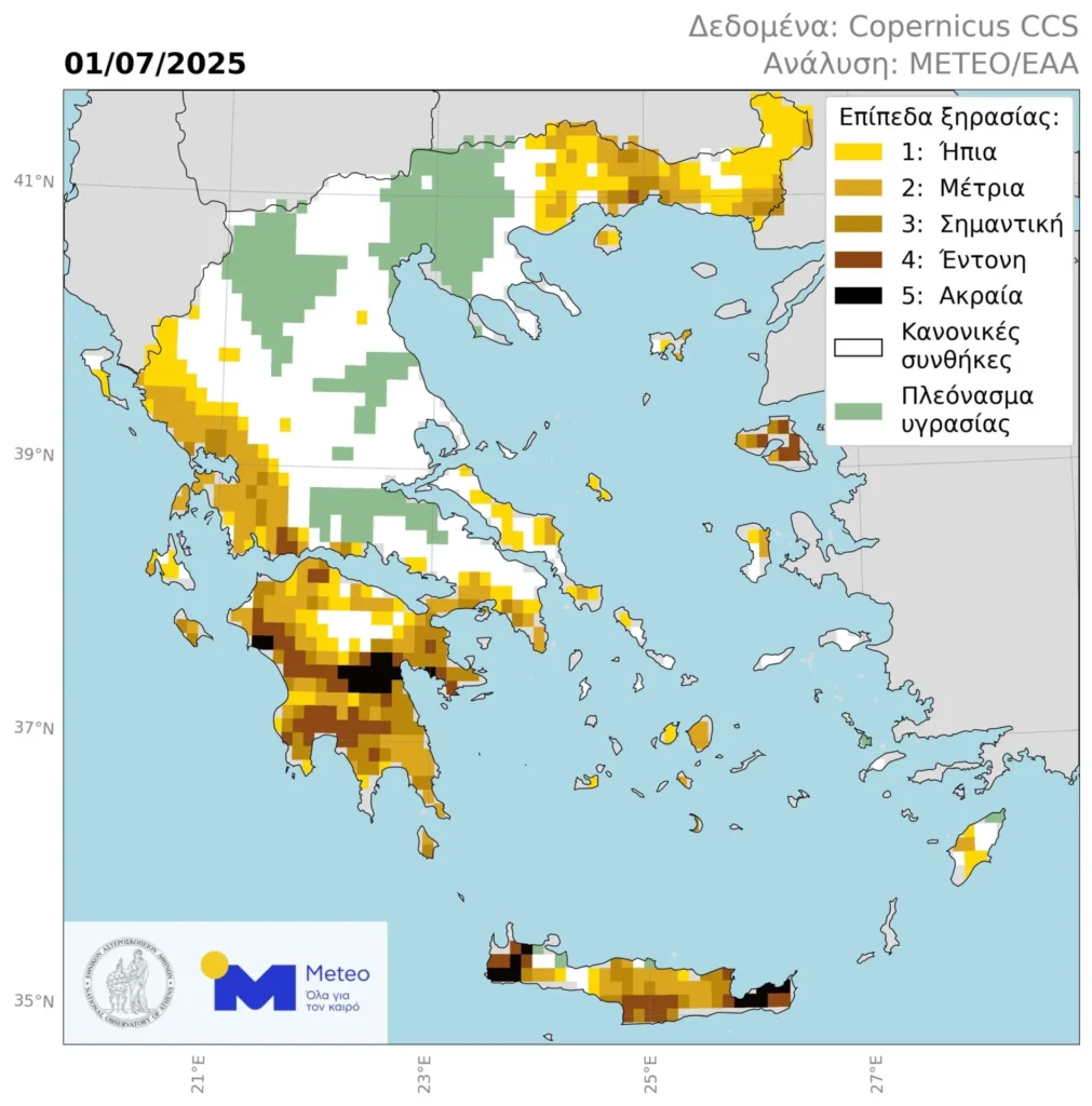 Εικόνα 1. Επίπεδα ξηρασίας στην Ελλάδα κατά την 1η Ιουλίου 2025. Οι περιοχές που βρίσκονται σε κατάσταση σχετικής ξηρασίας είναι χρωματισμένες σύμφωνα με την 5-βάθμια κλίμακα στο άνω δεξιά άκρο του χάρτη. Περιοχές όπου η εδαφική υγρασία είναι σημαντικά πάνω από τα κανονικά επίπεδα απεικονίζονται με πράσινο, ενώ περιοχές με εδαφική υγρασία κοντά στην μέση τιμή απεικονίζονται με άσπρο.