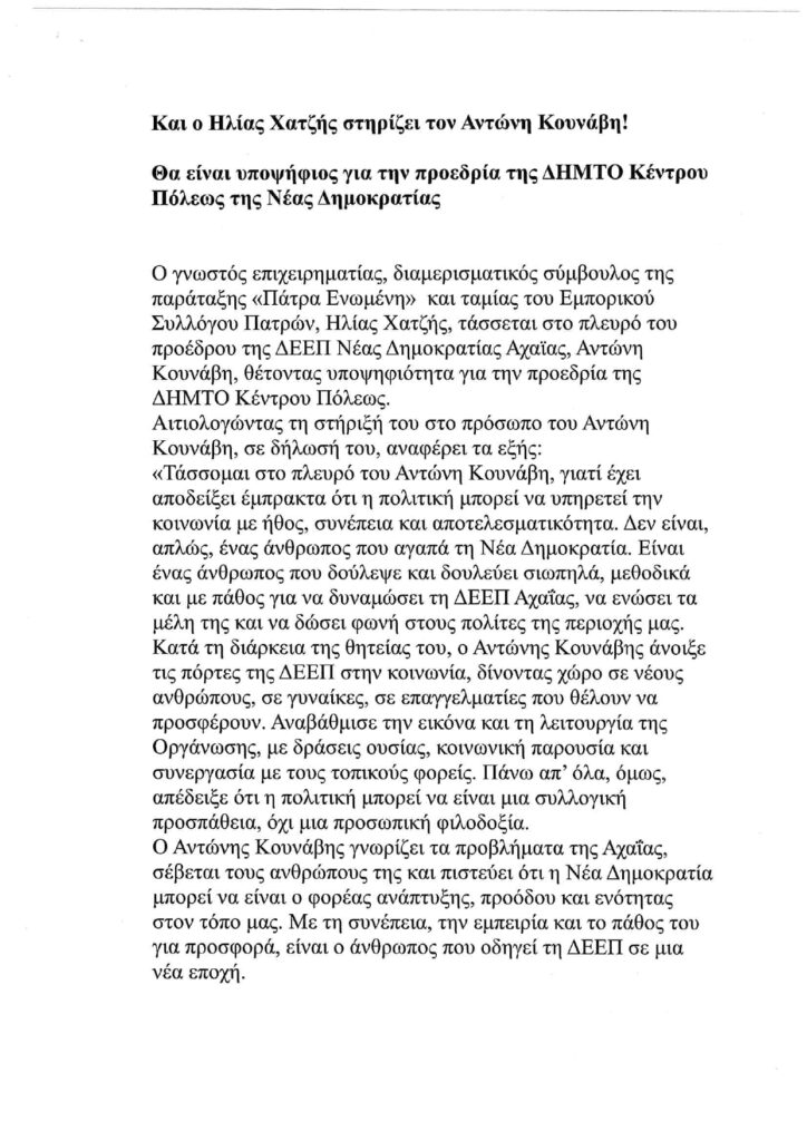 Home»Πολιτική»ΔΗΛΩΣΗ ΥΠΟΨΗΦΙΟΤΗΤΑΣ ΧΑΤΖΗΣ ΗΛΙΑΣ