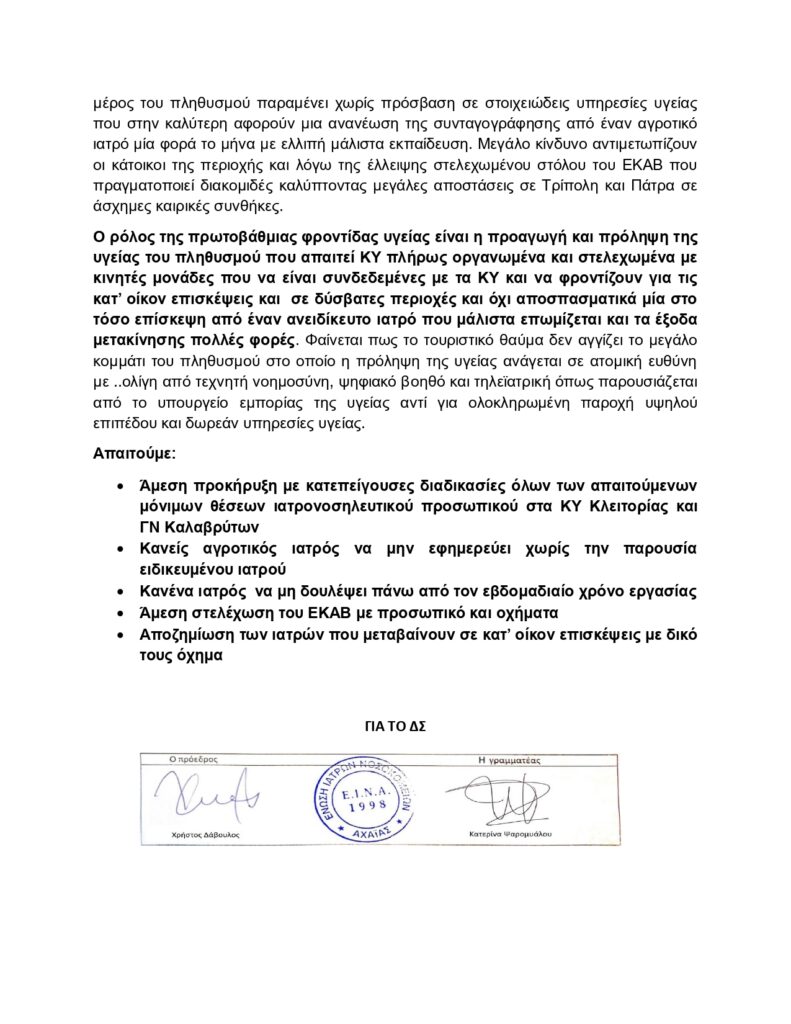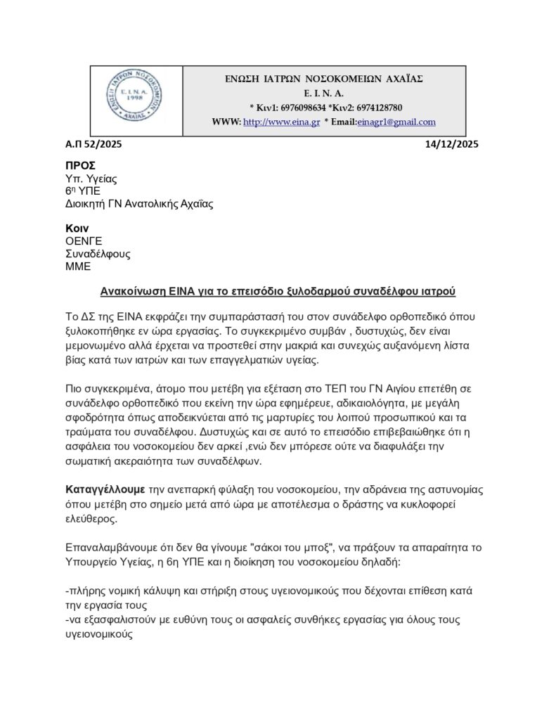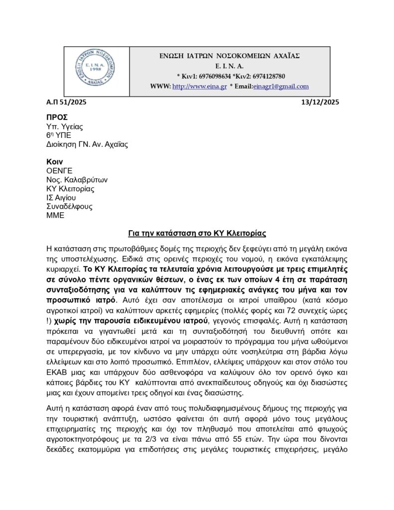 Η Ένωση Ιατρών Νοσοκομείων Αχαΐας  διαμαρτύρεται για την κατάσταση στο Κέντρο Υγείας  Κλειτορίας και για το περιστατικό ξυλοδαρμού συναδέλφου ιατρού