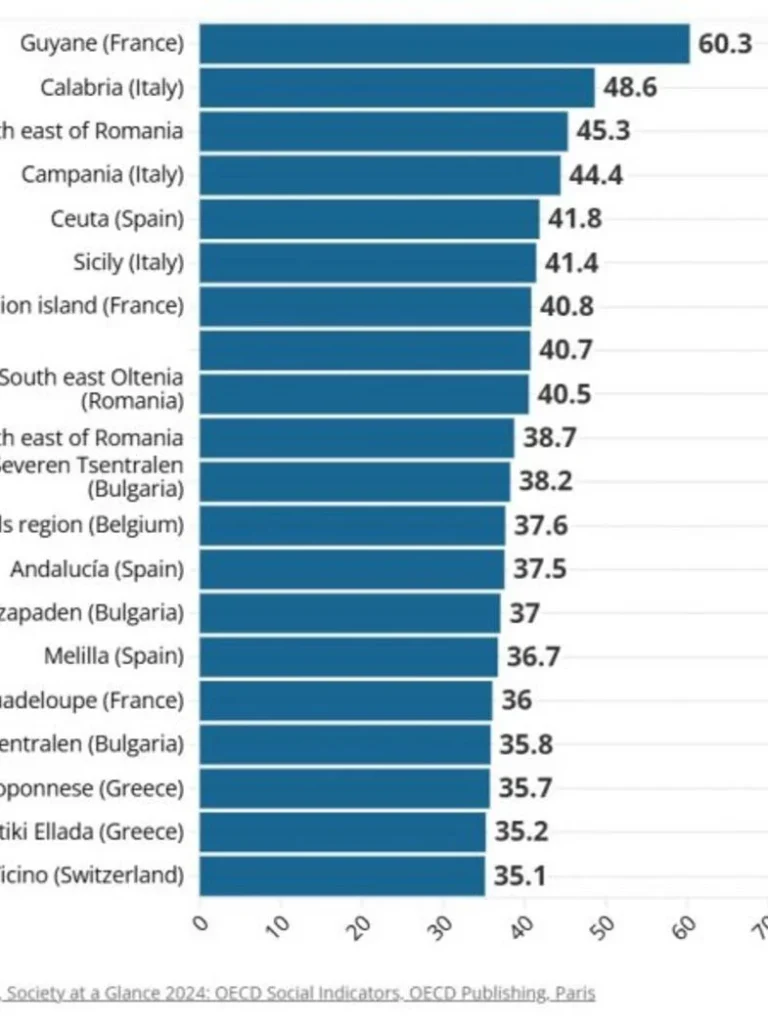 Το σύνολο δεδομένων προσδιορίζει 19 περιοχές σε όλο το ευρωπαϊκό μπλοκ όπου το ποσοστό των ατόμων που κινδυνεύουν από φτώχεια ή κοινωνικό αποκλεισμό υπερβαίνει το 35%, με πολλά από αυτά στη Βουλγαρία, τη νοτιοδυτική Ελλάδα, τη νότια Ισπανία και τη νότια Ιταλία — την περιοχή των Βρυξελλών του Βελγίου καθώς και το νοτιότερο καντόνι της Ελβετίας.