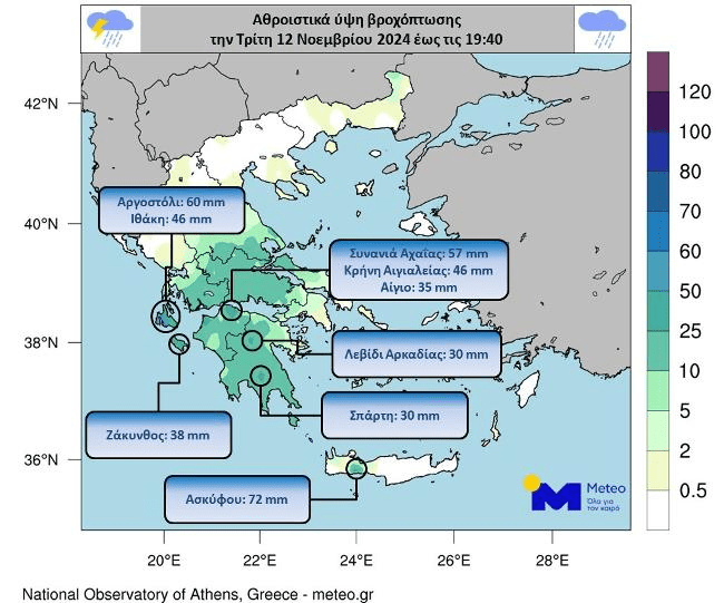 Αξιόλογες βροχοπτώσεις εκδηλώθηκαν κατά τη διάρκεια της Τρίτης 12/11, ενώ στα δυτικά και στην Κρήτη τα φαινόμενα ήταν τοπικά έντονα και συνοδεύτηκαν από καταιγίδες. Στο χάρτη που ακολουθεί αποτυπώνονται τα αθροιστικά ύψη βροχόπτωσης έως τις 19:40 το βράδυ της Τρίτης 12/11, όπως αυτά καταγράφηκαν από 510 μετεωρολογικούς σταθμούς του δικτύου αυτόματων μετεωρολογικών σταθμών του Εθνικού Αστεροσκοπείου Αθηνών / meteo.gr, ενώ επισημαίνονται ενδεικτικά ύψη βροχής.