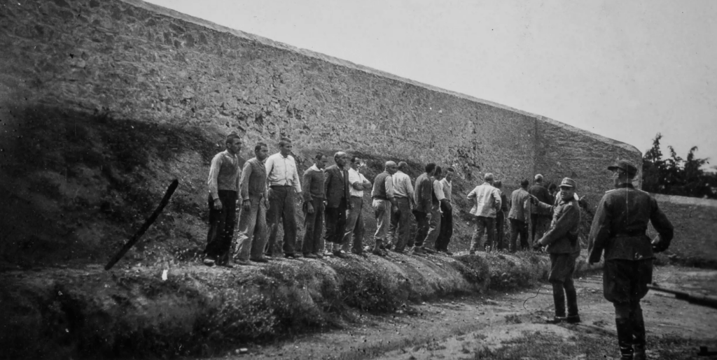 Σε μία από τις φωτογραφίες που παρουσιάστηκαν στο ΥΠΠΟ αποτυπώνεται η στιγμή της εκτέλεσης, αμέσως μετά το πυρ: οι ναζί έχουν μόλις πατήσει τη σκανδάλη και από τις κάννες των όπλων εκτινάσσονται σφαίρες και καπνός.