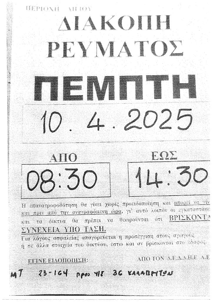 Προγραμματισμένη διακοπή ρεύματος στα Καλάβρυτα θα πραγματοποιηθεί την Πέμπτη 10 Απριλίου στα Καλάβρυτα από 08:30 έως 14:30, λόγω εργασιών αναβάθμισης του δικτύου στο μεγαλύτερο μέρος της πόλης.