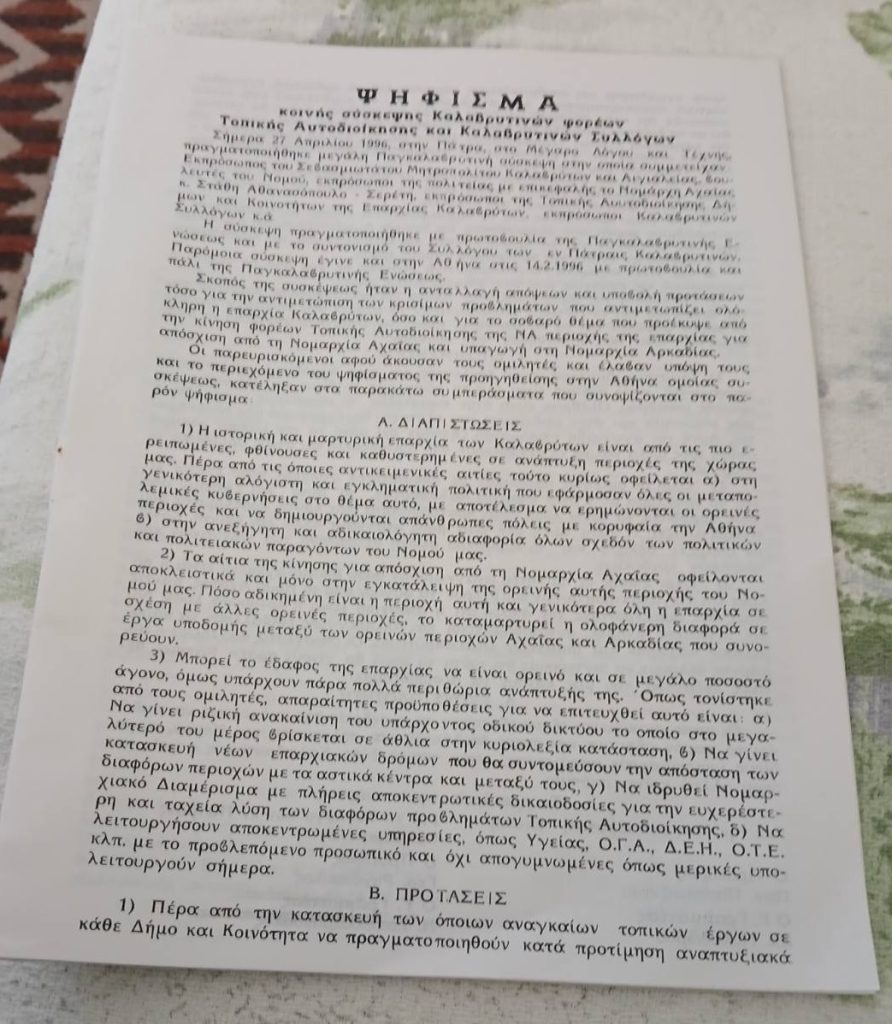 Αναφέρομε  στα παραπάνω γιατί σύμφωνα με Ψήφισμα που δημοσιεύθηκε στις 27 Απριλίου του 1996, μετά από συνάντηση που έγινε στην Πάτρα στο Μέγαρο Λόγου και Τέχνης και στο οποίο συμμετείχαν ο Κλήρος, ο τότε Νομάρχης Αχαΐας, εκπρόσωποι της Πολιτείας και της Τοπικής Αυτοδιοίκησης, φορέων και συλλογών ανέφεραν και συζήτησαν τα ίδια προβλήματα που συζητούμε και σήμερα, 29 χρόνια μετά.