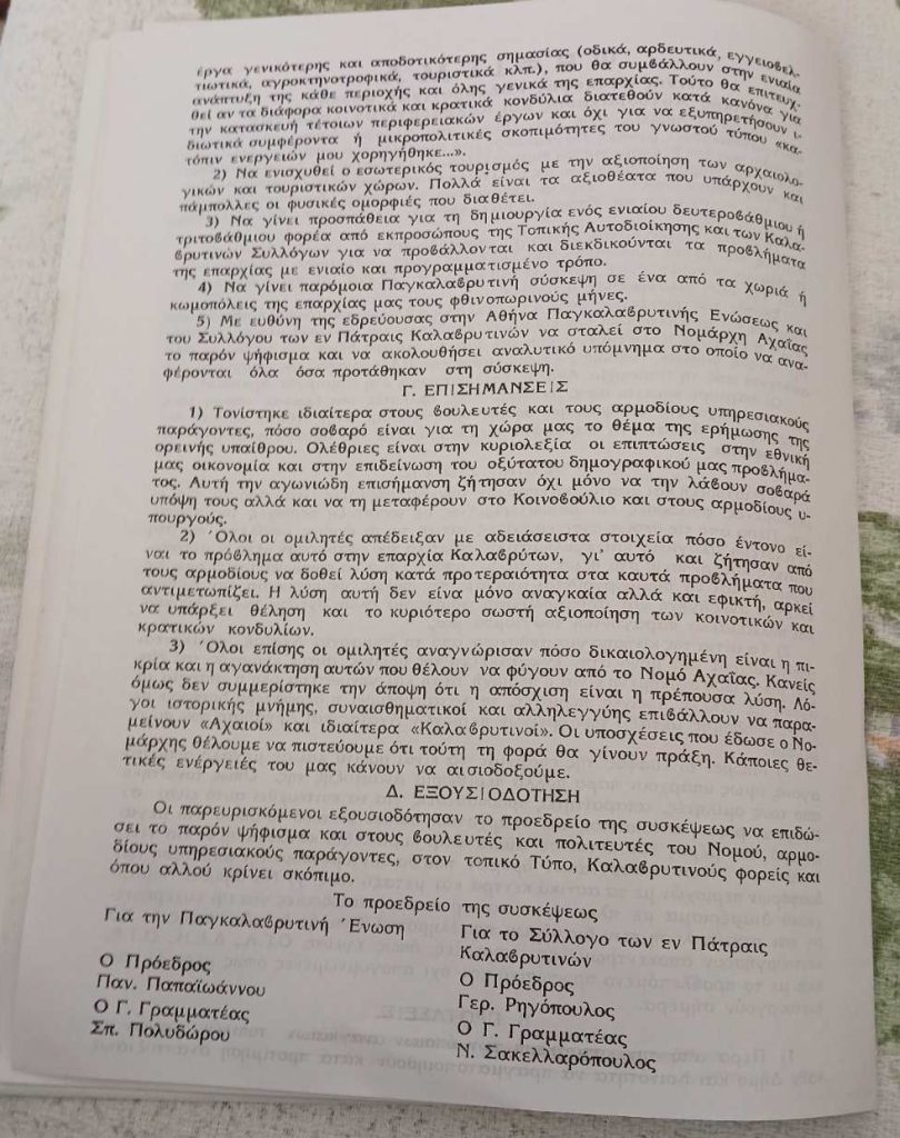 Συζήτησαν, αντάλλαξαν απόψεις και υπέβαλαν προτάσεις για την αντιμετώπιση των κρίσιμων προβλημάτων  που αντιμετωπίζει η τότε Επαρχία Καλαβρύτων νυν Δήμος Καλάβρυτων,  καθώς και το ενδεχόμενο απόσχισης μέρους της Επαρχίας από το Νομό Αχαΐας στο Νομό Αρκαδίας.