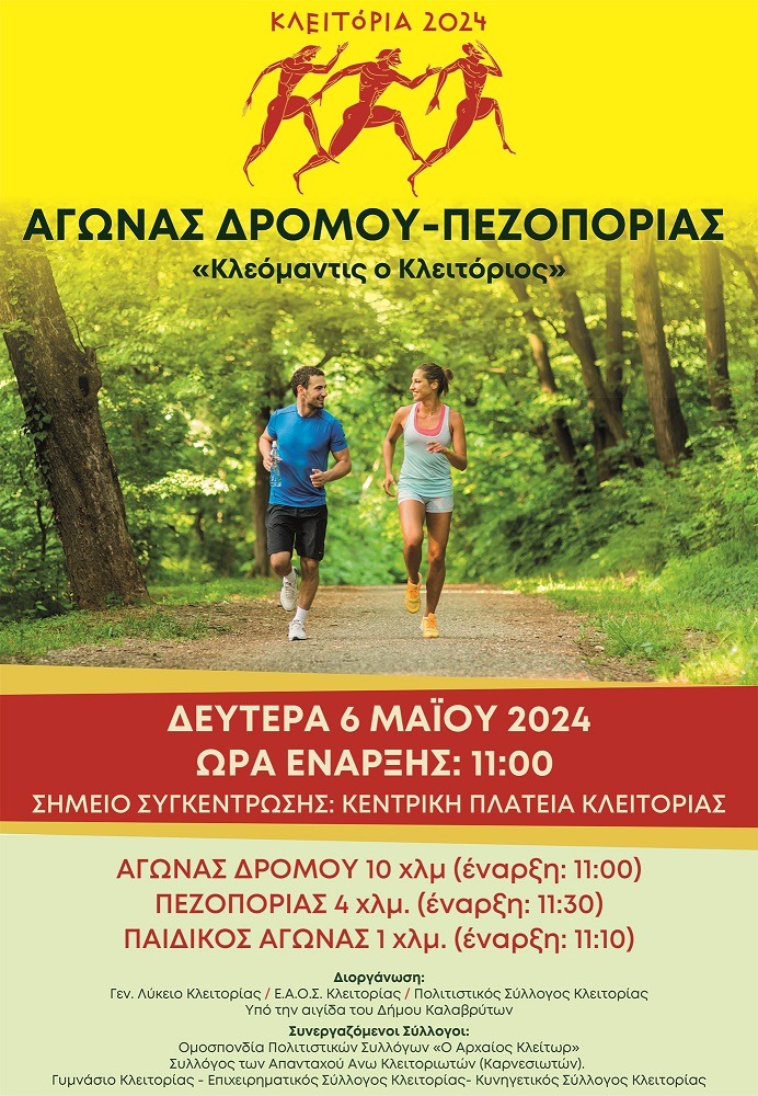 Δευτέρα 6 Μαΐου 2024, στην Κλειτορία: «Τρέχουμε όλοι για τον Αρχαίο Κλείτορα: 3ος Αγώνας Δρόμου-Πεζοπορία- Παιδικός αγώνας‘Κλεόμαντις ο Κλειτόριος’»προς τιμήν του αρχαίου Ολυμπιονίκη Κλεομάντεως, στο πλαίσιο των εκδηλώσεων «Κλειτόρια 2024»,