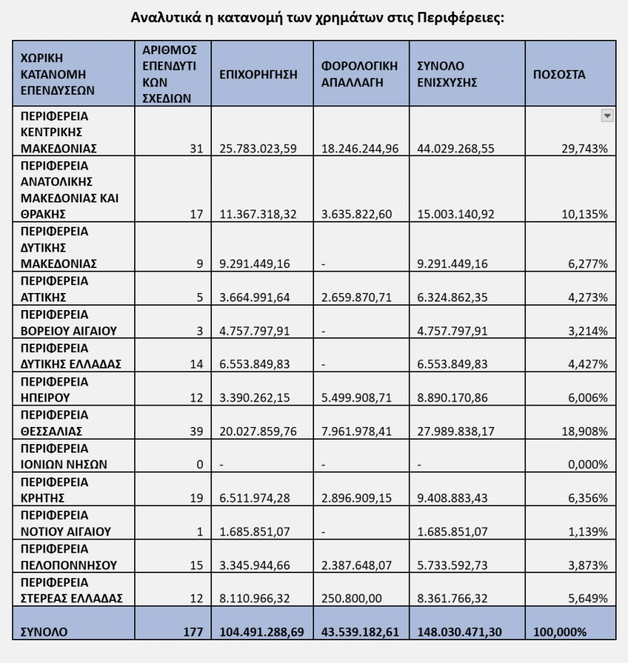 Στην Περιφέρεια Θεσσαλίας εγκρίθηκε ο μεγαλύτερος αριθμός επενδυτικών σχεδίων (39), ενώ στην Περιφέρεια Κεντρικής Μακεδονίας αναπτύσσεται το μεγαλύτερο ύψος των επενδύσεων, απορροφώντας το 30% των συνολικών ενισχύσεων.