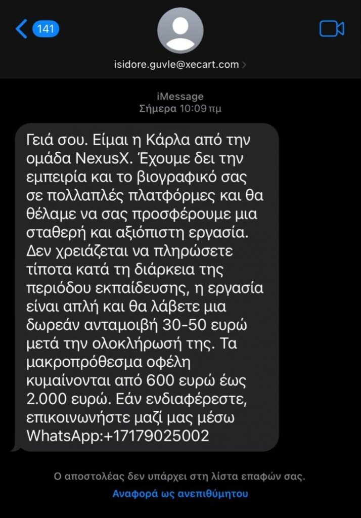 Τελευταίο κρούσμα είναι ένα SMS, το οποίο στέλνεται μαζικά τις τελευταίες ώρες και τάζει δουλειά με ποσό έως και 2.000 ευρώ για μηνιάτικο!