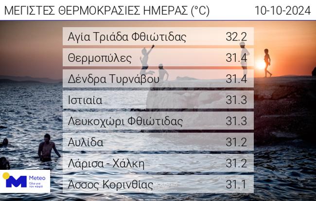 Υψηλές για την εποχή θερμοκρασίες καταγράφηκαν την Πέμπτη 10/10 με τις υψηλότερες τιμές της να σημειώνονται στη Θεσσαλία και στην Ανατολική Στερεά και Πελοπόννησο. Όπως φαίνεται στον πίνακα που παρουσιάζει τους 8 σταθμούς του δικτύου αυτόματων μετεωρολογικών σταθμών του meteo.gr / Εθνικού Αστεροσκοπείου Αθηνών που κατέγραψαν τις υψηλότερες θερμοκρασίες, η μέγιστη σημειώθηκε στην Αγία Τριάδα Φθιώτιδας (32.2 °C) και ακολούθησαν οι Θερμοπύλες και τα Δένδρα Τυρνάβου (31.4 °C).