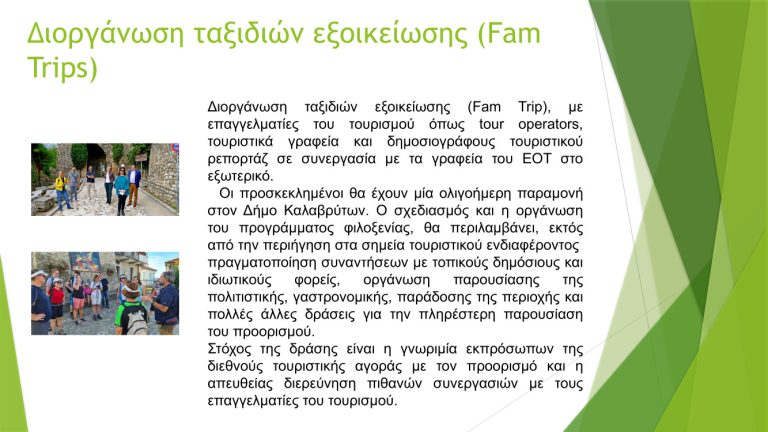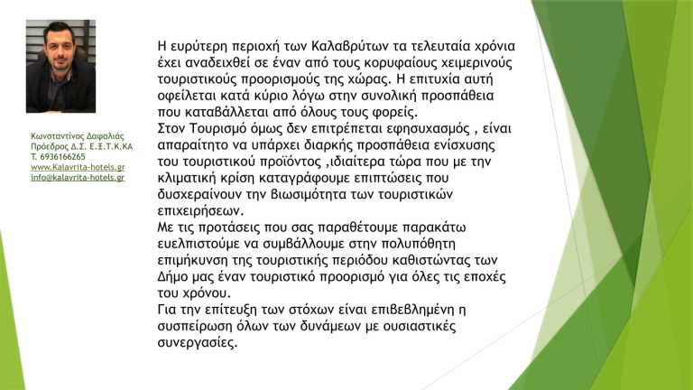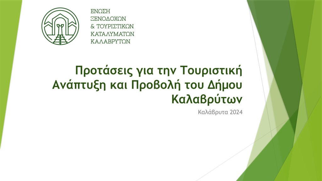 Η Ένωση Ξενοδόχων και Τουριστικών Καταλυμάτων Καλαβρύτων, παρουσίασε μια σειρά από ενδιαφέρουσες προτάσεις, για την τουριστική ανάπτυξη του Δήμου Καλαβρύτων, στη συνεδρίαση της Επιτροπής Τουριστικής Ανάπτυξης του Δήμου Καλαβρύτων που πραγματοποιήθηκε την Δευτέρα 15 Ιουλίου2024.