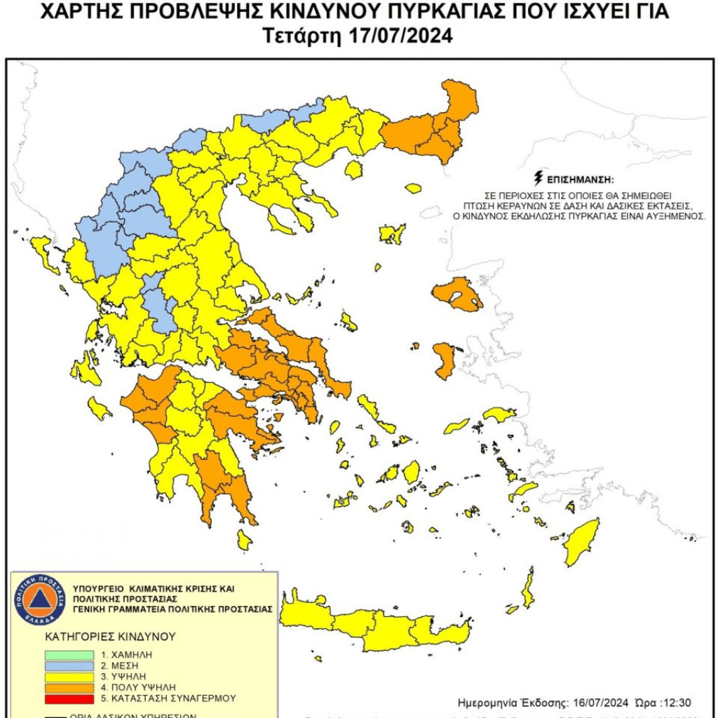 Αντιμέτωπες με πολύ υψηλό κίνδυνο φωτιάς βρίσκονται σήμερα, Τετάρτη (17/7) 14 περιοχές της χώρας, σύμφωνα με το χάρτη πρόβλεψης κινδύνου πυρκαγιάς που εκδίδει η Γενική Γραμματεία Πολιτικής Προστασίας.