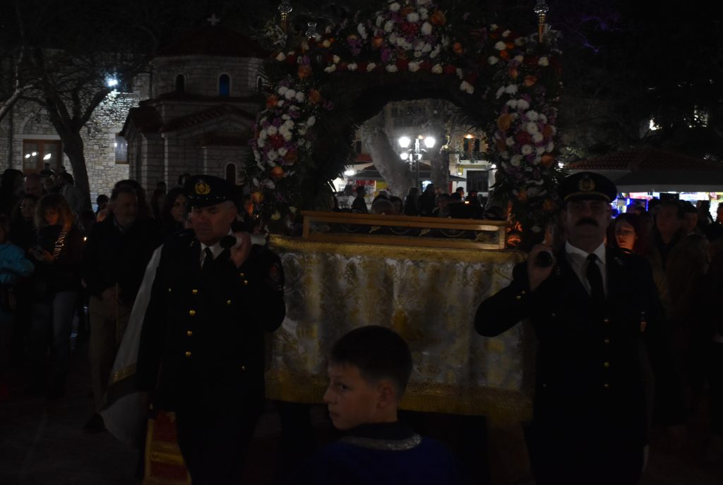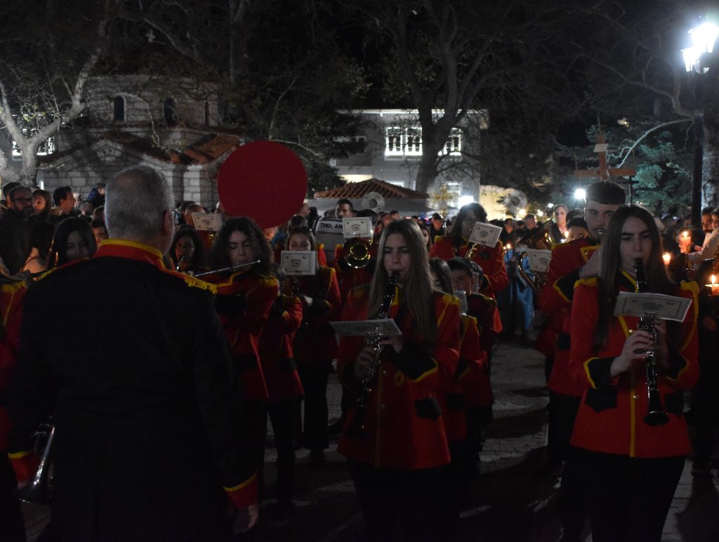 Υπό τους ήχους θρησκευτικών ψαλμωδιών και τα πένθιμα εμβατήρια της η Φιλαρμονικής του Δήμου μας, η πομπή ξεκίνησε την πορεία της στους κεντρικούς δρόμους της πόλης.