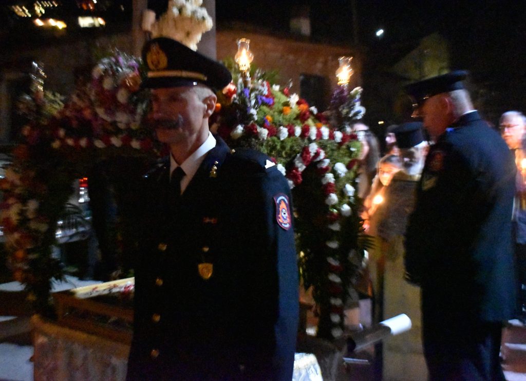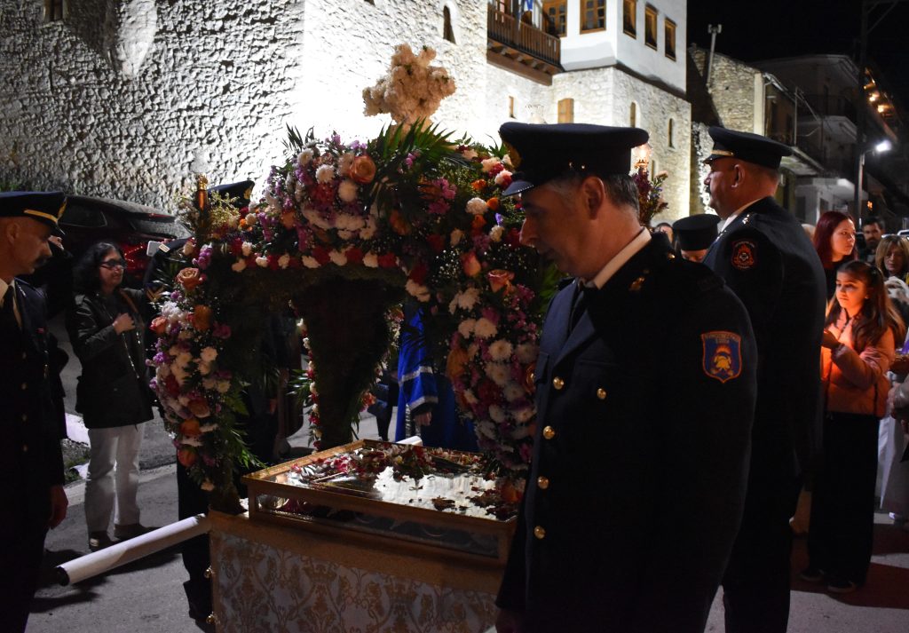 Τον επιτάφιο κουβάλησαν άνδρες της Πυροσβεστικής Υπηρεσίας  Καλαβρύτων και τον συνόδευσε η Φιλαρμονική του Δήμου.