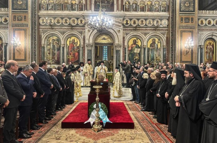 Ο Αρχιεπίσκοπος Αθηνών Ιερώνυμος τελεί τρισάγιο υπέρ αναπαύσεως του Μακαριστού Αρχιεπισκόπου, παρόντος του πρωθυπουργού Κυριάκου Μητσοτάκη και του προέδρου του ΠΑΣΟΚ Νίκου Ανδρουλάκη.