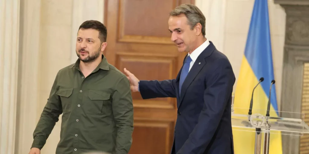 Αργότερα Κυριάκος Μητσοτάκης και Βολοντίμιρ Ζελένσκι θα κάνουν από κοινού δηλώσεις και θα δώσουν μια μικρή συνέντευξη τύπου.