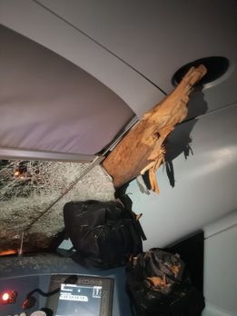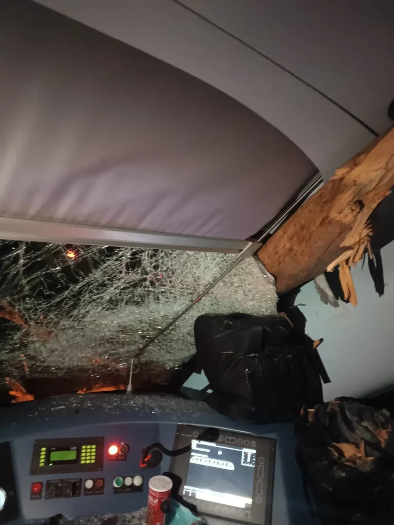 Όπως θα δείτε και στις φωτογραφίες που δημοσίευτηκαν στο facebook, από θαύμα γλίτωσε ο μηχανοδηγός, καθώς το δέντρο καρφώθηκε στην καμπίνα του.