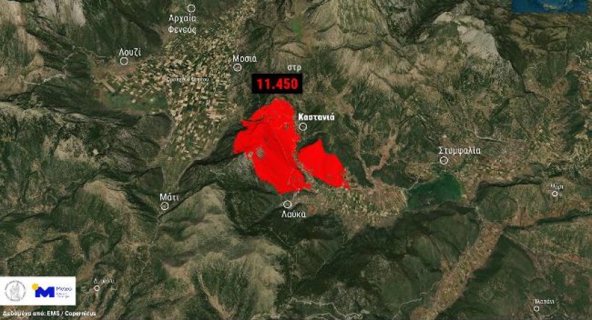 Σύμφωνα με την ανάλυση των δορυφορικών δεδομένων του ευρωπαϊκού μηχανισμού Copernicus EMS, έως και τις 12:23 της Τρίτης είχαν καεί περίπου 11.450 στρέμματα δασικών και χορτολιβαδικών εκτάσεων στις περιοχές μεταξύ Καστανιάς, Λάυκας, Μοσιάς και Οροπεδίου Φενεού.