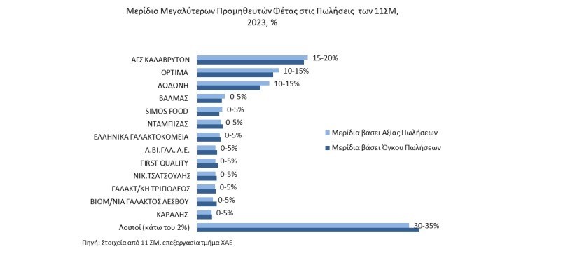 Οι 12 μεγαλύτεροι προμηθευτές αντιπροσωπεύουν το 73% του συνόλου των πωλήσεων Φέτας σε αξία, ενώ στη Φέτα ιδιωτικής ετικέτας οι 13 μεγαλύτεροι το 93%.