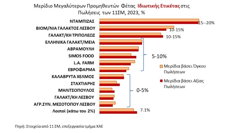 Σύμφωνα με την έρευνα ο καταναλωτής προτιμά να αγοράζει επώνυμο προϊόν. Συγκεκριμένα το 80% των πωλήσεων το 2023 αφορούσε επώνυμη Φέτα και 20% προϊόντα Ιδιωτικής Ετικέτας. Ωστόσο, κατά τη διάρκεια της έρευνας (2/2023-6/2024) η μεταστροφή προς τα προϊόντα ιδιωτικής ετικέτας ήταν εμφανής. Μία τάση που συνεχίστηκε και στο α’ εξάμηνο του 2024.
