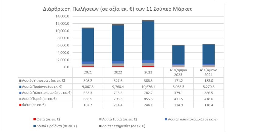 Σύμφωνα με τα στοιχεία της χαρτογράφησης που πραγματοποίησε η Επιτροπή Ανταγωνισμού, το 2023 μέσα απ’ το δίκτυο καταστημάτων των 11 μεγαλύτερων αλυσίδων Σούπερ Μάρκετ της χώρας πραγματοποιήθηκαν πωλήσεις Φέτας συνολικού ύψους 244,1 εκατ. ευρώ, από 214,4 εκατ. ευρώ το 2022. Έτσι οι πωλήσεις Φέτας αποτέλεσαν το 2% των συνολικών πωλήσεων που είχαν οι 11 αλυσίδες Σούπερ Μάρκετ πέρυσι. Όπως παρατηρεί η Επιτροπή Ανταγωνισμού, ο ετήσιος ρυθμός μεταβολής της αξίας των πωλήσεων Φέτας κυμάνθηκε σε 14% τόσο για το 2022 όσο και για το 2023, ενώ το Α΄ εξάμηνο του 2024 μειώθηκε στο 3% σε ετήσια βάση.
