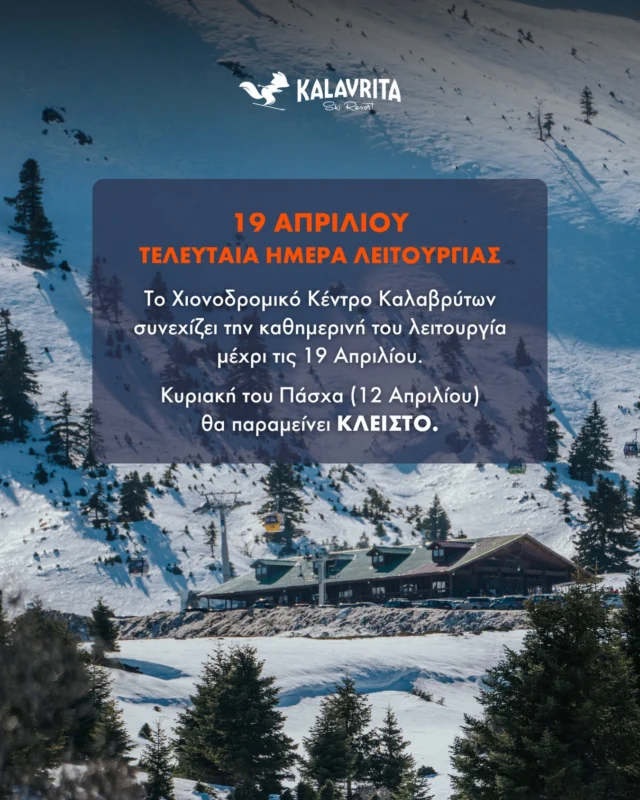 Το χιονοδρομικό κέντρο Καλαβρύτων συνεχίζει την καθημερινή λειτουργία του μέχρι τις 19 Απριλίου, εφόσον παραμένουν επαρκείς οι συνθήκες χιονοκάλυψης.